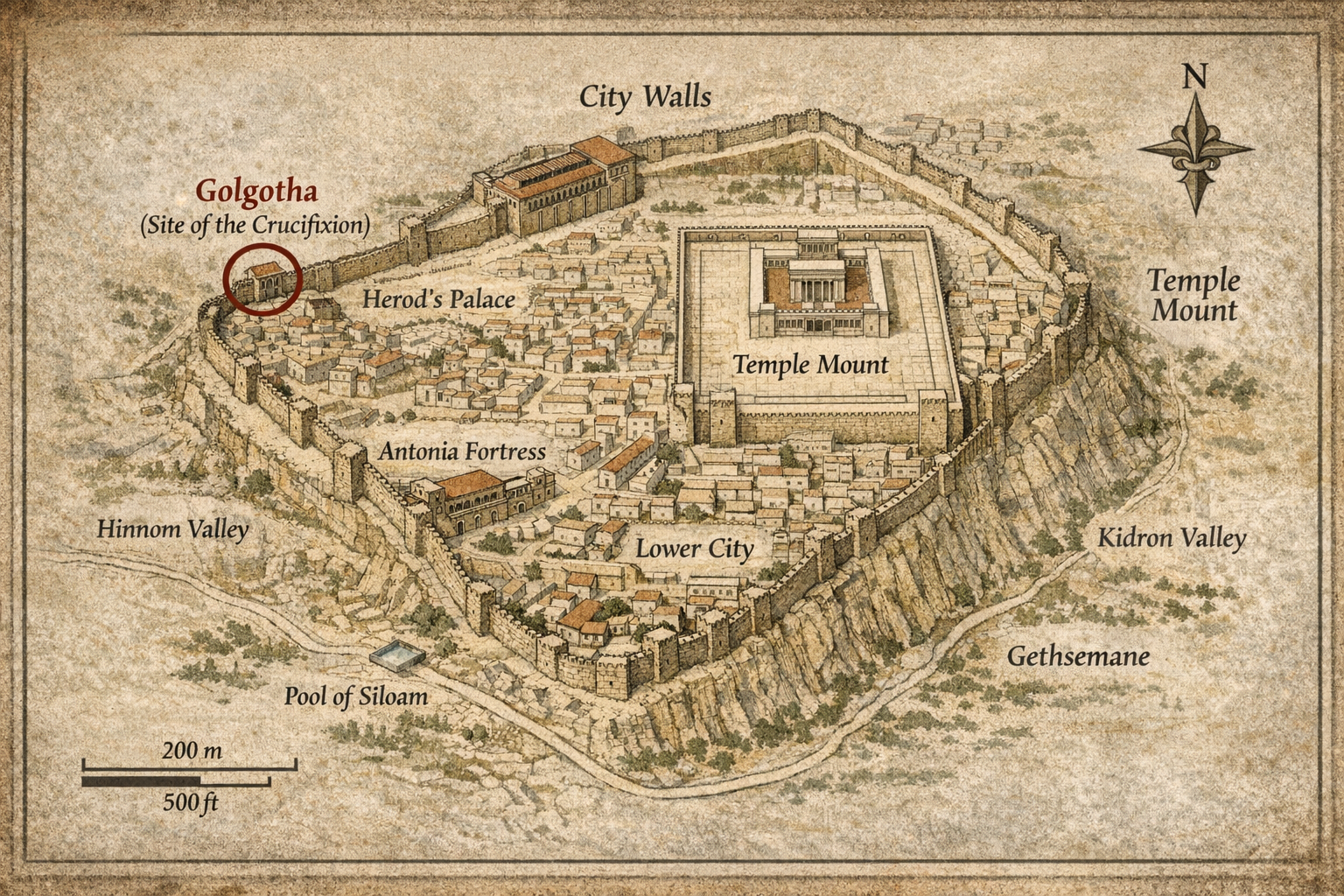 Golgotha was part of a quarry ridge about 60 feet above the city gate just northwest of the Second Wall in Jerusalem and near the Damascus Road. Normally the Roman’s procedure after a crucifixion was to remove the body, take down the crossbeam (patibulum), leave the upright stake in the ground and reuse the wood. Everything was different on April 3, 22 CE. Luke 23:44–45, “It was now about noon, and darkness came over the whole land until three in the afternoon, for the sun stopped shining.”